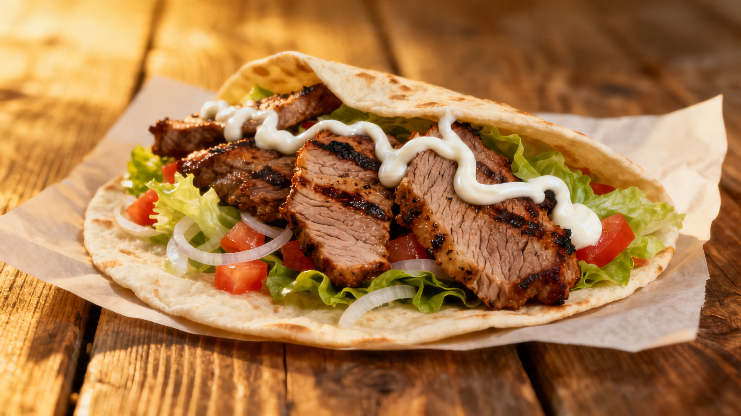 Les accompagnements varient, mais l'équilibre reste le même : un pain (pita, lavash, pain turc ou baguette), des légumes (chou blanc, tomates, oignons, concombres marinés), et une sauce (yaourt, harissa, tomate épicée, tzatziki).