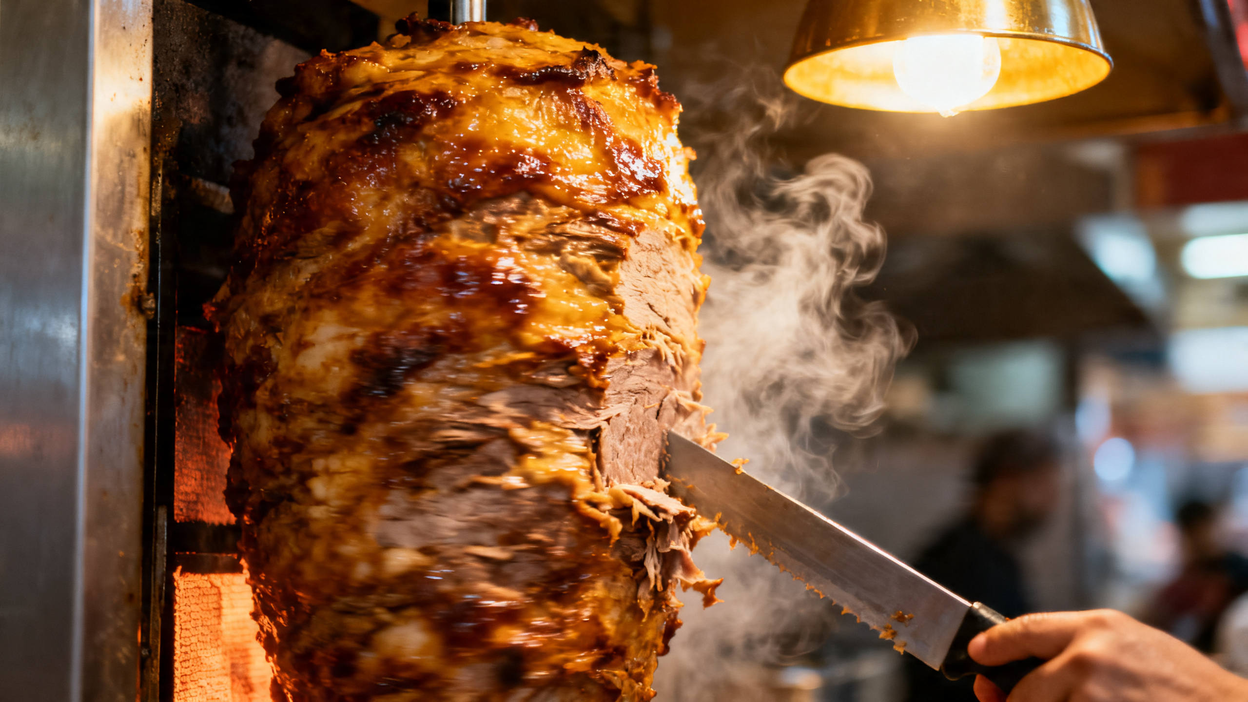 La version qu'on connaît en Europe, c'est le döner kebab — "döner" signifiant "qui tourne". La viande, agneau, veau ou poulet selon les versions, est empilée en couches sur une broche verticale qui tourne face à une source de chaleur. Le cuisinier tranche au fil de la cuisson, ce qui donne une surface croustillante et un intérieur encore moelleux.